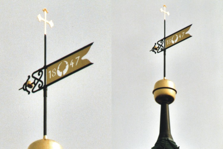 Wetterfahne wurde nach Bilddokumenten hergestellt, Kugel nach historischen Fragmenten gefertigt.